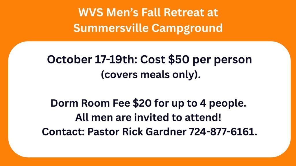 WVS Men’s Fall Retreat at Summersville Campground will be on October 17-19th. Cost is $50 per person (covers meals only): Dinner on Friday, Saturday 3 meals, Sunday Breakfast. Dorm Room is $20 for up to 4 people. All men are invited to attend! Contact Pastor Rick Gardner with questions.