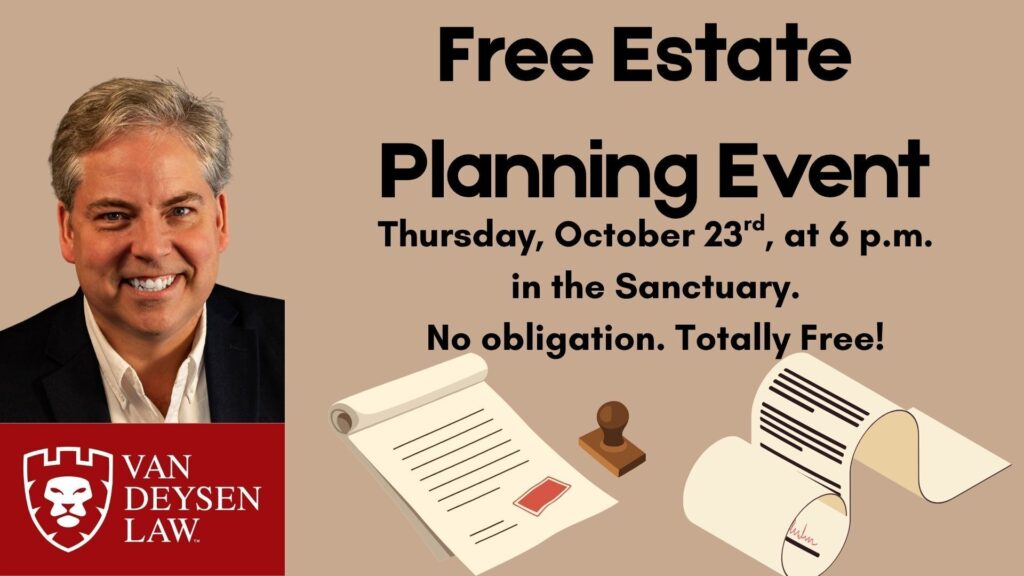 Estate Planning Event—Thursday, October 23rd, at 6 p.m. in the Sanctuary. Everyone is invited to join us for this free, informational event. Legal Estate Planning Workshop: Basic estate planning documents that everyone should have including Wills and Powers of Attorney. How to protect assets from the high cost of nursing home care. All who attend will receive the opportunity for a free one-hour consultation with the presenting attorney.