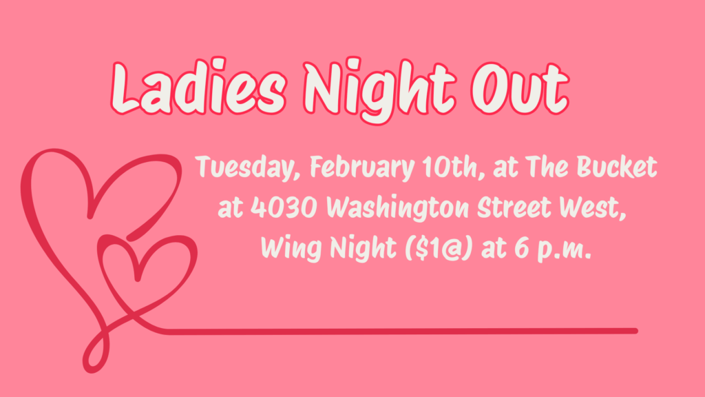 All ladies are invited to join us at The Bucket, 4030 Washington St. W., on Tuesday, February 10th, at 6 p.m. Wing Night ($1@). Bring a friend along! Please sign up in the foyer if you plan to go!