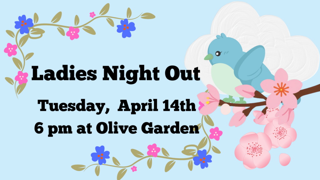 All ladies are invited to join us as meet for dinner together at Olive Garden at 6 p.m. on April 14th! Please sign up in the foyer.