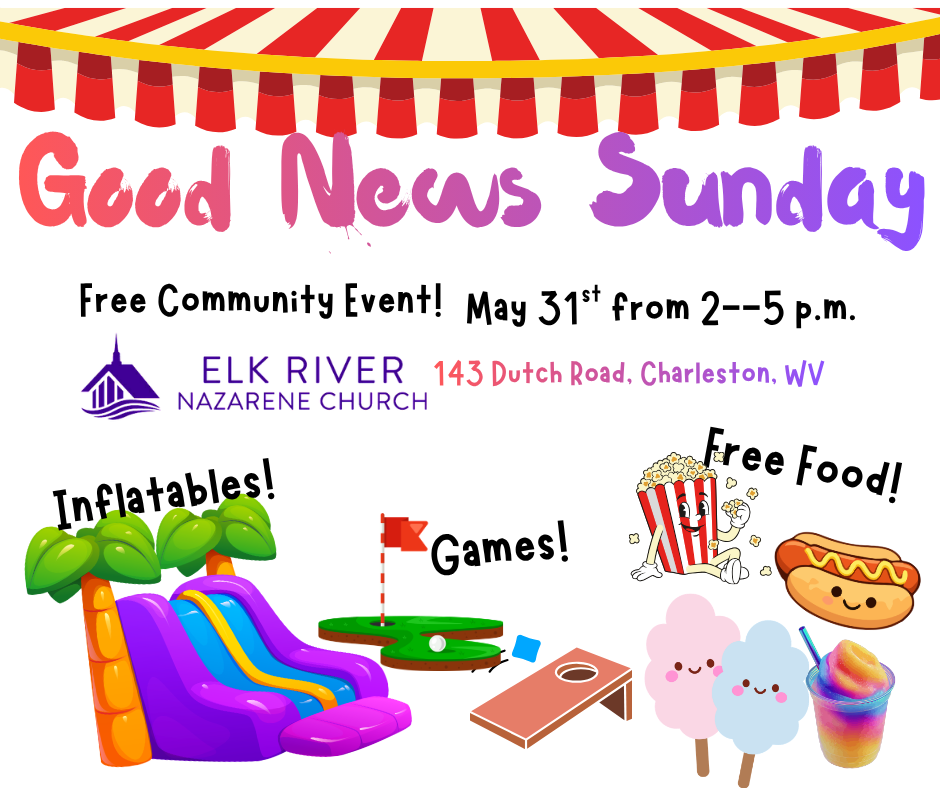 You are invited to join us for our Good News Sunday Free Community Event on May 31st 2:00–5:00 p.m. on the parking lot at Elk River Nazarene Church, 143 Dutch Road!